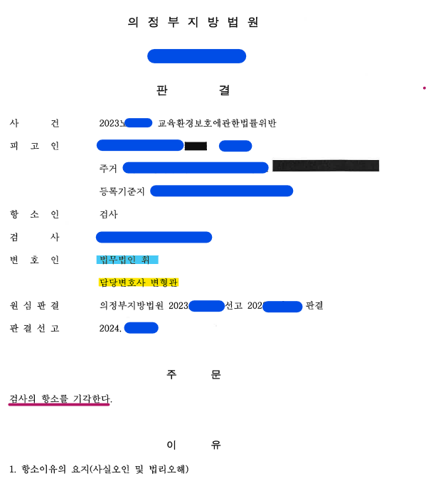 오늘은 검사의 항소 끝에 교육환경보호법 위반 사건에 대하여 무죄를 확정받은 사례에 대하여 소개해드리고자 합니다.