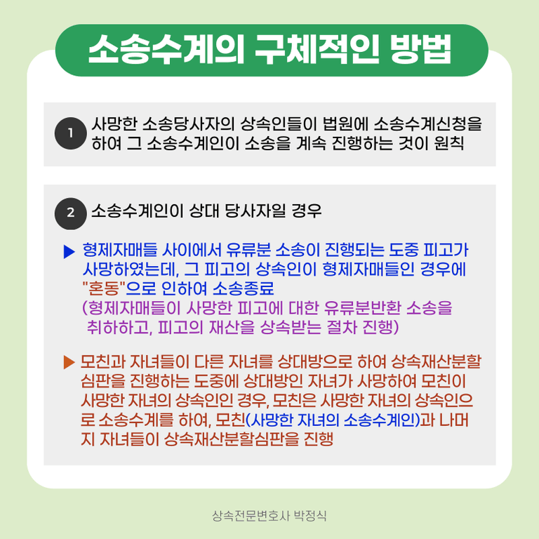 따라서 소송이 진행되는 도중에 사망한 소송당사자 대신 그 상속인들이 '소송수계신청'을 하여 그 소송수계인들이 계속하여 소송을 진행할 수 있는 것입니다.