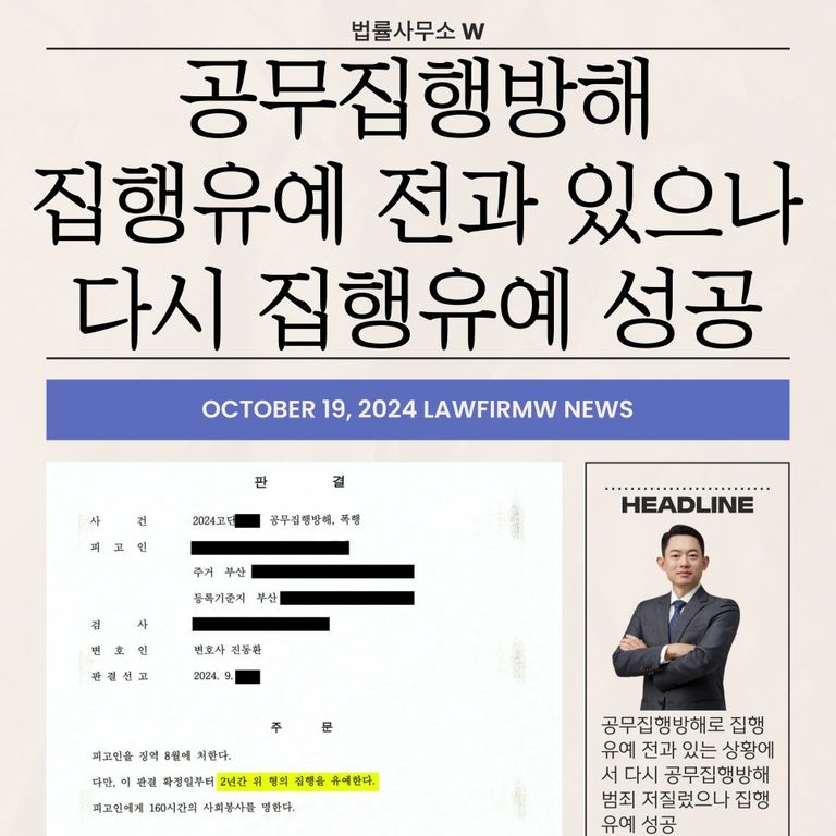 오늘은 공무집행방해 사건으로 집행유예를 선고받은 적이 있던 당사자가 다시 공무집행방해 범행을 저지른 사건에서 다시 한번 집행유예를 선고받고 감옥을 피할 수 있었던 사건을 말씀드렸습니다.