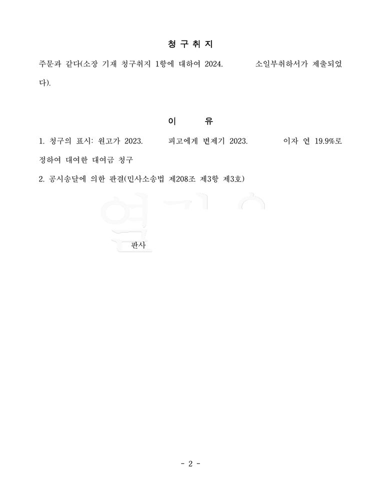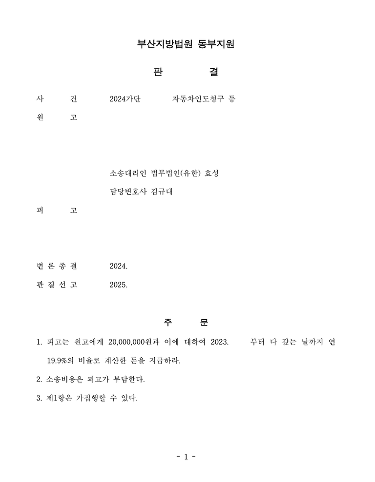 저는 즉각 피고를 상대로 자동차인도청구와 대여금청구를 하나의 소로 제기하였고, 소송 도중 피고는 자동차를 의뢰인에게 반환하여 자동차인도청구 부분은 취하하였으며, 대여금에 관하여 법원은 원고 승소 판결을 선고하여 압류 등 강제집행으로 대여금을 변제받았습니다.