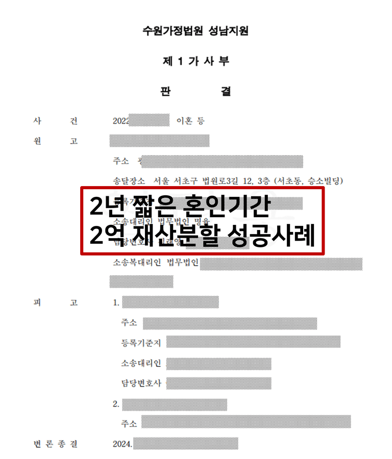 사건 개요 : 의뢰인께서는 배우자의 부정행위로 인해 깊은 상처를 받으시고, 짧은 혼인 기간에도 불구하고 재산 분할에 대한 걱정으로 저를 찾아오셨습니다. 특히, 가사노동에 전념하셨던 만큼 경제적 기여에 대한 입증이 어려울 것이라는 우려를 표명하셨습니다.