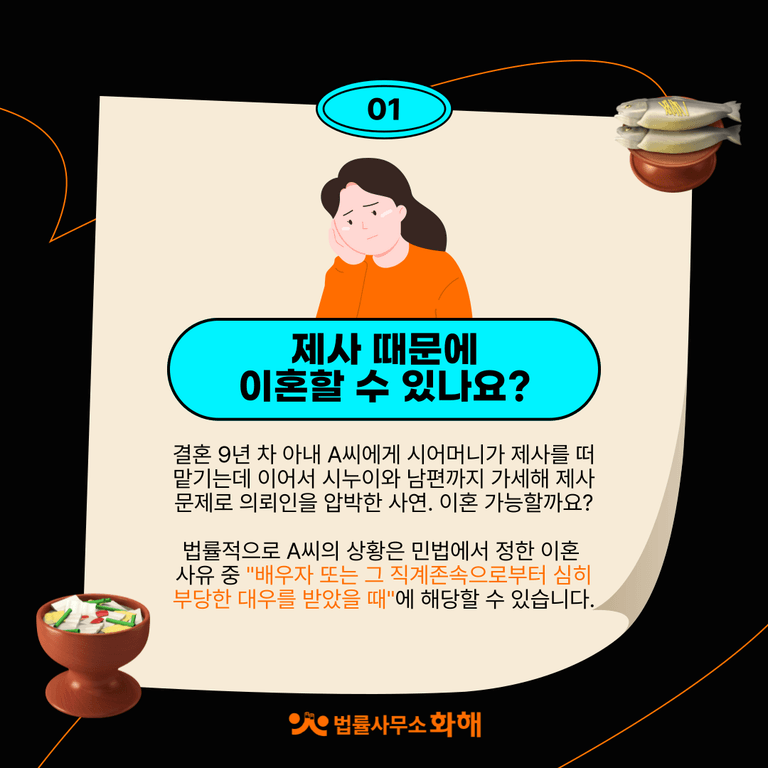 명절이 다가오면 차례상 준비로 마음이 무거워지는 분들이 많으시죠. 특히 유교적 전통이 강하거나 제사가 잦은 집안이라면 이로 인한 갈등이 더 깊어질 수 있습니다. 최근 저희 화해를 찾아주신 분의 사연도 이로 인한 이혼을 고민하시는 내용이었습니다. 오늘은 이 사연을 통해 제사나 명절 차례상 문제가 법적으로 이혼 사유가 될 수 있는지 함께 알아보겠습니다.