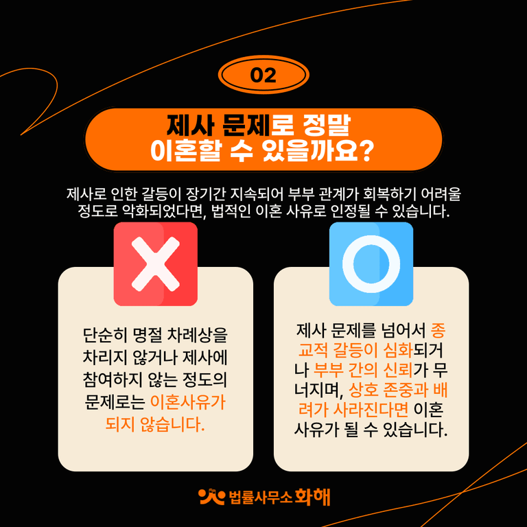 이처럼 제사 문제가 단순한 가사 분담의 차원을 넘어 부부 관계의 근간을 흔드는 수준에 이르렀을 때 명절 차례나 제사로 인한 갈등이 혼인관계를 파탄에 이르게 할 정도로 심각하다면, 그 상황에 맞는 구체적인 증거를 제시하고 소송을 통해 법적으로 다퉈볼 수 있습니다. 특히 제사 강요가 개인의 종교의 자유와 충돌하는 경우, 이는 이혼의 정당한 사유로 인정될 가능성이 더욱 높아집니다.