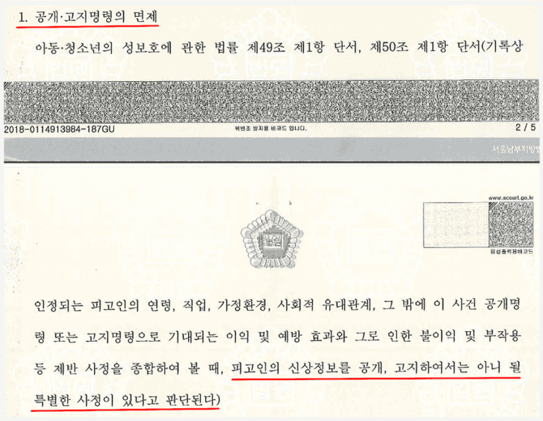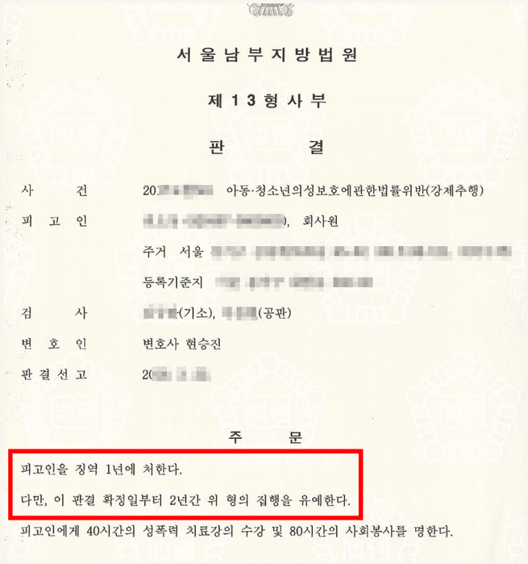 법원에서는 의뢰인에게 선고 가능한 징역형의 하한인 징역 1년에 집행을 유예하는 형을 선고하는 한편 공개·고지명령을 면제 하여주었습니다.