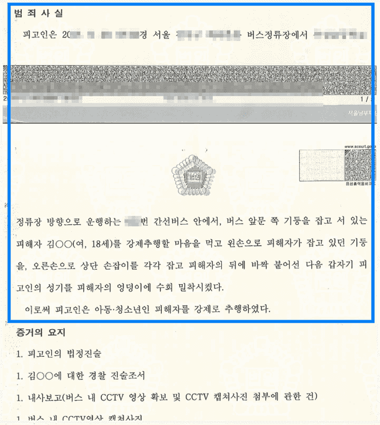 의뢰인은 불법 촬영과 지하철 성추행으로 인해 각 벌금형의 처벌을 받은 전력이 있었습니다. 그런데 또 다시 버스 안에서 교복을 입고 있어서 청소년이라는 점을 알 수 있는 피해자의 둔부에 자신의 성기를 밀착시키는 추행을 하다가 아동·청소년의성보호에관한법률위반(강제추행)의 현행범으로 체포되어 다시 법정에 서게 되었습니다.