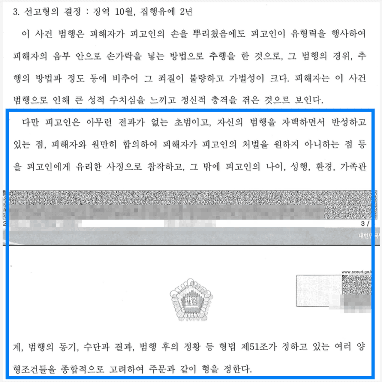 한편 가벼운 죄인 강제추행이 적용되어 유죄가 인정 되더라도 죄질이 좋지 않고 추행의 정도도 심하였으므로 의뢰인에게 선처가 필요한 이유를 재판부에 납득시켜야 했습니다.