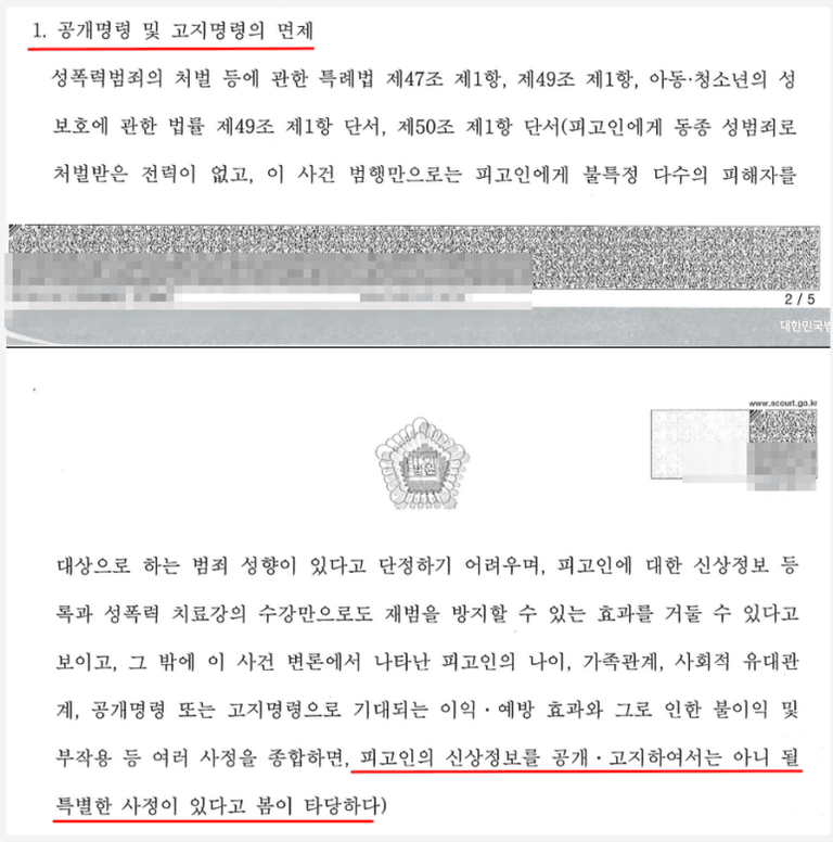 재판부에서는 의뢰인에게 인정되는 죄명을 준유사강간이 아닌 강제추행으로 인정하고, 의뢰인의 여러 유리한 정상을 고려하여 의뢰인에게 징역형의 집행을 유예하는 판결을 하였고 신상정보 공개 및 고지명령도 면제하였습니다.