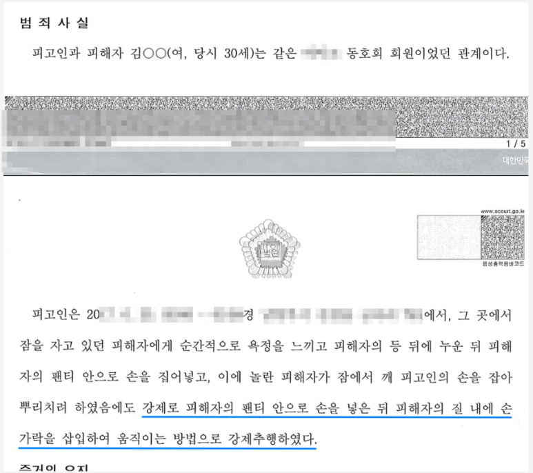 의뢰인은 인터넷 카페를 통해서 동호회 활동을 하다가 회원들과 함께 MT를 가게 되었습니다. 그런데 의뢰인은 MT 장소였던 펜션에서 평소 남몰래 성적인 호감을 느끼고 있던 피해자가 잠이 든 사이에 피해자의 속옷 안으로 손을 넣어 음부를 만지는 추행을 하였습니다. 그리고 이에 놀란 피해자가 깨어나서 의뢰인의 손을 뿌리치려 했지만 의뢰인은 오히려 피해자의 성기에 손가락을 넣는 행동까지 하게 되었고, 결국 피해자의 고소로 인하여 준유사강간 혐의로 법정에 서게 되었습니다.