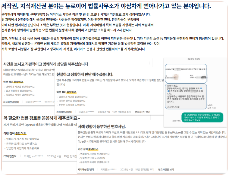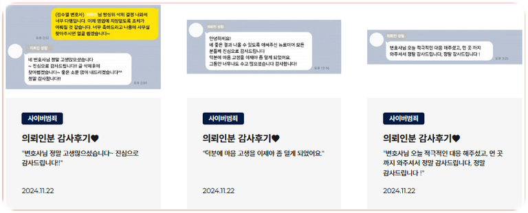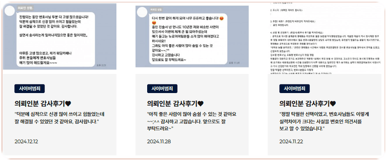 다년간 쌓아온 노하우로 저작권 및 사이버 범죄 사건을 성공적으로 해결해 왔으며, 사건 종료 후 고객들로부터 반복적인 의뢰를 받는 높은 수임률로 신뢰를 입증해왔습니다.
