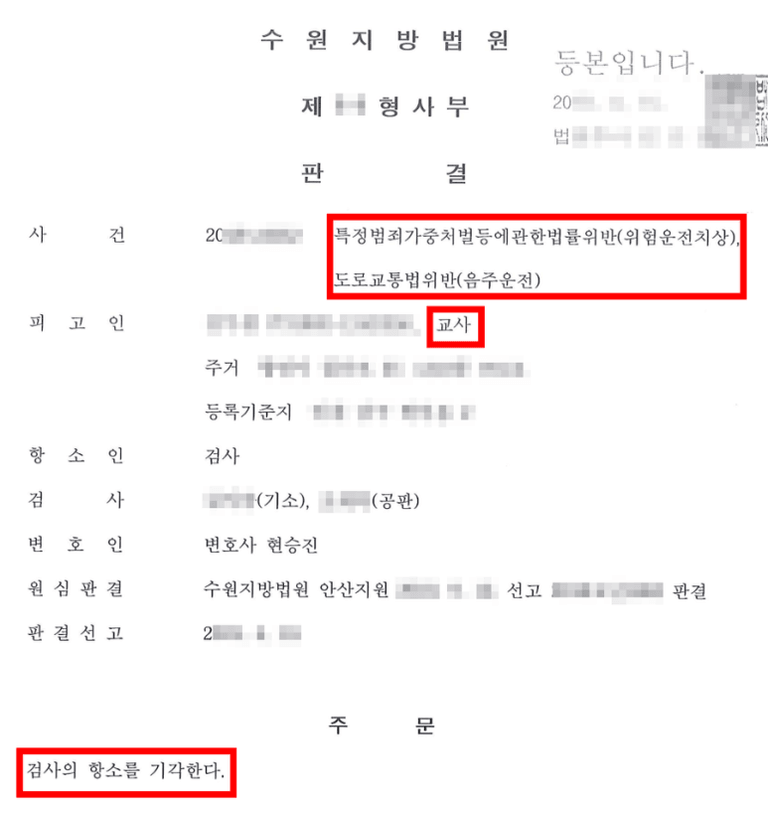그런데 사립학교법 및 교육공무원법에 따르면 교사인 의뢰인이 징역형의 집행유예를 받게 되면 징계절차 없이도 당연퇴직 처리가 되어 직업을 잃게 될 수 있는 상황이었으므로 반드시 벌금형의 선처가 필요한 상황이었습니다.