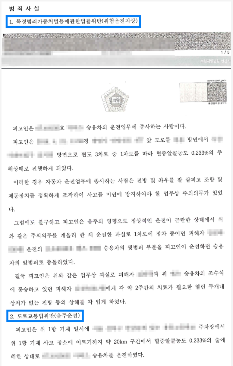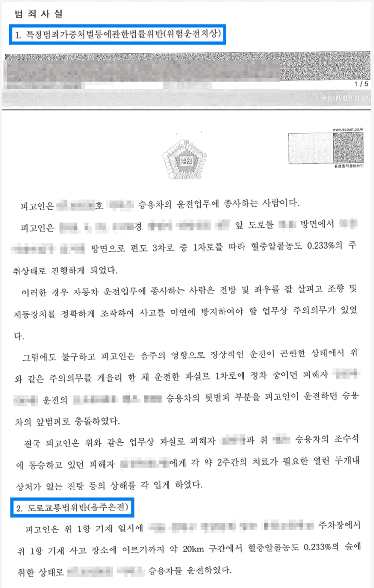 특정범죄가중처벌등에관한법률위반(위험운전치상)의 죄는 범죄 전력이 전혀 없는 초범이라도 징역형의 집행유예를 선고 받는 경우가 다수였는데, 의뢰인은 혈중알코올농도가 너무 높았기 때문에 벌금형의 선처를 기대하기가 더욱 어려웠습니다.