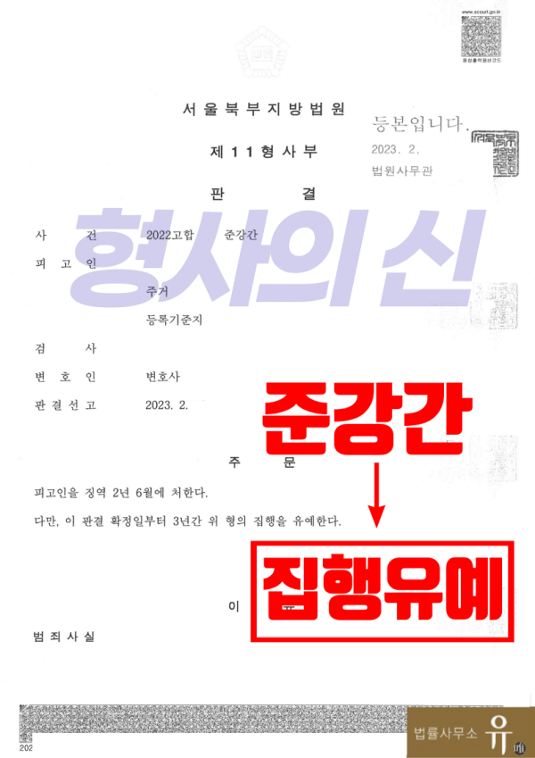 서울북부지방법원은, 의뢰인에게 유리한 양형자료와 소명 내용이 담긴 법률사무소 유(唯)의 형사전문변호사가 작성한 구체적인 변호인의견서와 반성문, 가족들의 탄원서 등을 참작함은 물론 불리한 정상이 있음에도 의뢰인의 진지한 반성과 피해자와의 합의, 사회적 유대관계 주장은 물론 시각 장애인 봉사단체에서의 봉사 활동 내역, 범행의 경위나 범행 후의 정황 등을 종합적으로 고려하여 검찰의 징역 3년 구형에도 불구하고, 피고인(의뢰인)에게 징역 2년 6개월에 집행유예 3년을 선고하였습니다.