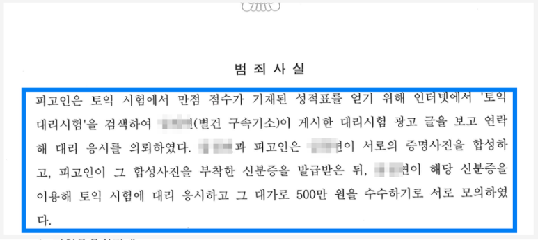 의뢰인은 직장의 인사평가에서 고득점의 공인영어성적이 필요하자 인터넷에서 ‘토익 대리시험’으로 검색하여 알게 된 OOO에게 대리시험을 의뢰하였습니다. 이 과정에서 의뢰인은 자신과 OOO의 사진을 합성한 후 이 사진을 이용하여 자동차운전면허증을 재발급 받아 이를 이용하여 OOO이 대리시험을 볼 수 있도록 하는 한편, 그 대가로 OOO에게 500만 원을 지급하였습니다.