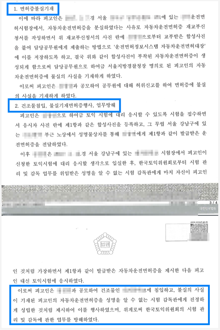의뢰인은 토익시험 주관사의 업무를 방해하였다는 업무방해, 공무원에게 거짓 사실을 신고하여 면허증을 발급받은 면허증불실기재, 그와 같은 면허증을 사용한 불실기재면허증행사 및 범죄를 목적으로 시험장 건물에 들어간 건조물침입(OOO과 공범이므로 그의 범행이 의뢰인에게도 똑같이 인정됨)의 죄가 모두 인정되는 상황이었으므로, 비록 다른 범죄전력이 없는 초범이지만 징역형의 집행유예 이상의 처벌로 사회생활에 여러 불이익을 겪게 될 수 있었습니다. 따라서 벌금형으로 목표로 사건을 진행해야 했습니다.
