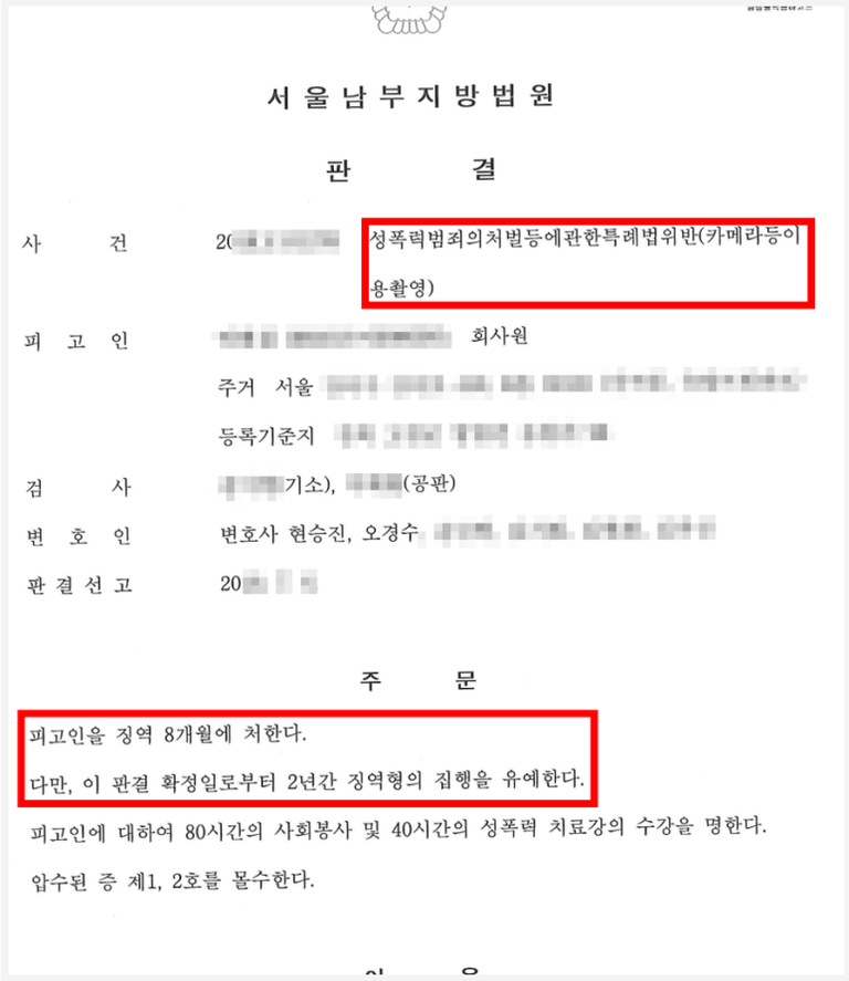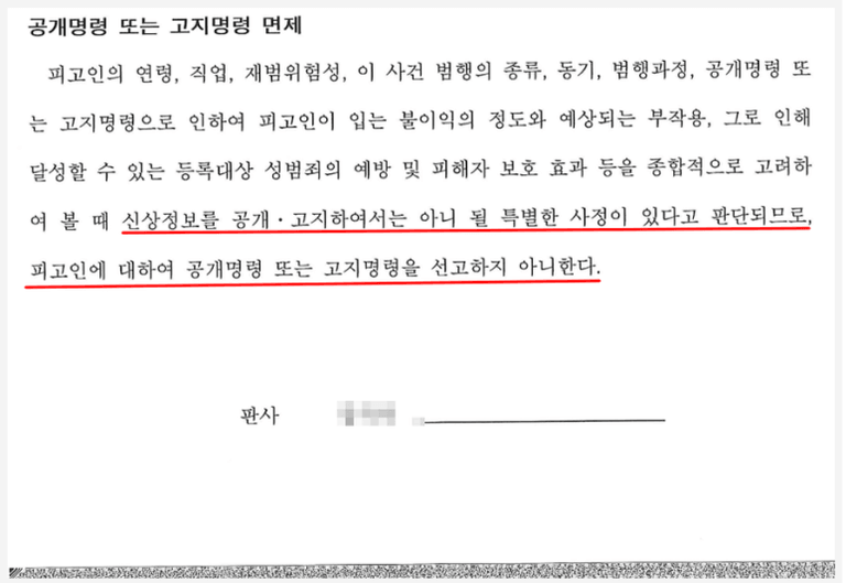 이러한 변호인의 노력 덕분에 의뢰인은 징역형의 집행유예를 선고 받아 구속 수감되는 것을 피할 수 있었고, 더불어 신상정보 공개명령과 고지명령도 면할 수 있었습니다.