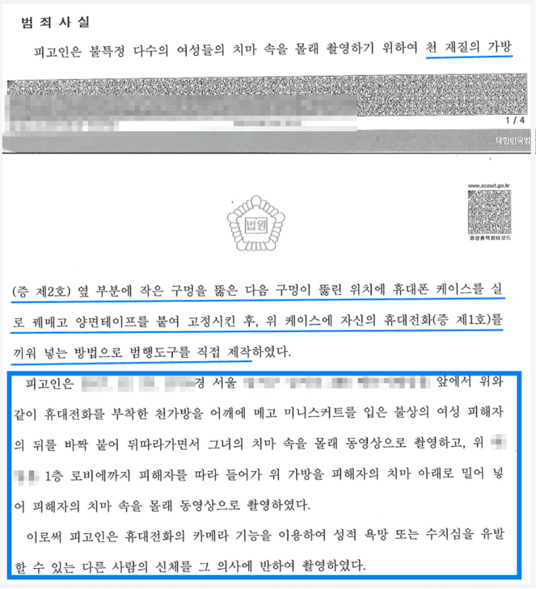 의뢰인은 과거 휴대전화를 이용하여 여성들의 치마 속을 몰래 촬영한 범행으로 기소유예 처분과 벌금형의 처벌을 받은 전력이 있었습니다. 하지만 그 후에도 잘못된 버릇을 고치지 못하였고, 에코백의 하단에 구멍을 뚫은 후 휴대전화를 구멍에 맞춰 고정되도록 하여 범행도구를 직접 만들어서 피해자를 따라가면서 치마 속을 촬영하는 범행을 저지르고 말았습니다.