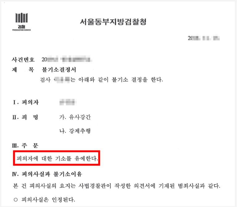 검사는 의뢰인이 진심으로 뉘우치고 있는 점, 피해자로부터 용서를 받은 점 등을 적극적으로 고려하여 의뢰인에게 기소유예의 선처를 하여주었습니다.