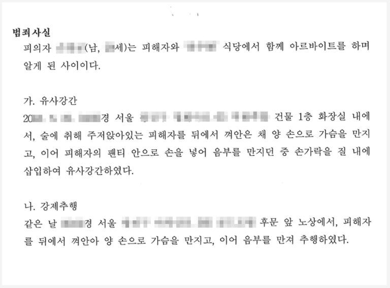 의뢰인은 근무 중이던 가게에서 일을 마치고 사장과 아르바이트생이던 피해자 등과 함께 술자리를 가지게 되었는데, 어느새 자신의 주량을 훌쩍 넘는 술을 마시고 만취하고 말았습니다. 이로 인해 의뢰인은 필름이 끊기게 되었는데, 며칠 후 사장으로부터 의뢰인이 피해자를 따라 화장실에 들어가서 가슴을 주무르고 성기에 손가락을 넣는 행위를 하였다는 이야기를 전해 듣게 되었습니다.