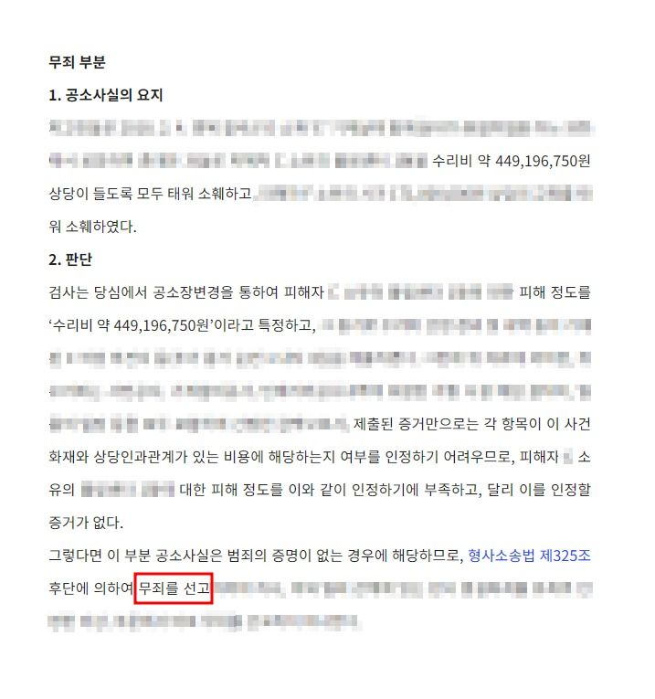 저는 재판부에 검찰이 제출한 증거를 탄핵하며, 수리비가 그 4억4천에 이를 수 없다는 주장을 펼쳤고, 재판부도 이를 받아들여 수리비 4억 4천만원 상당에 대하여는 무죄로 판단하였습니다.