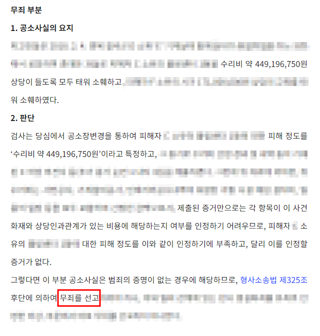 다른 실화부분에 대한 피해는 유죄로 판단되었습니다. 그러나 형사판결에서 손해액이 특정되지 않은 부분에 대하여는 민사소송에서 유리한 자료로 쓰이게 되었습니다.