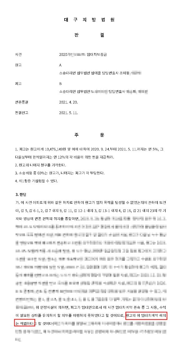 대구지방법원은 제가 주장한 바와 같이이 사건 임대차계약의 목적달성이 어렵다고 보고 임대차계약의 해지가 적법하다는 판결을 내렸습니다.