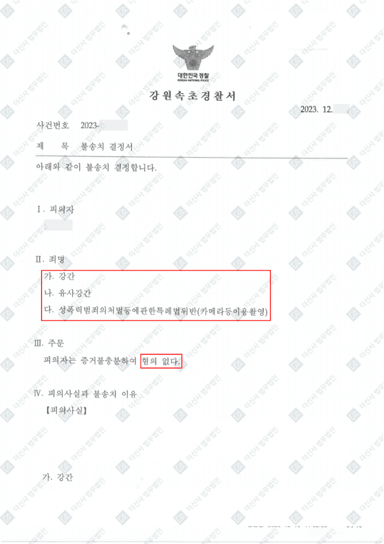 애초에 상대방과 합의된 성관계를 가진 상황이었기에 어떤 문제로 고소를 당한 건지 이해할 수 없던 의뢰인은 심적으로 매우 불안정한 상황이었기에 해당 부분에 대한 케어를 진행하며, 사건 진행에 대한 검토를 시작하였습니다. 상대방이 의뢰인과의 관계 이후 다음날 함께 있었던 cctv 등의 자료 등을 통해 상대의 주장에 대한 허점을 공략하였고, 결국 의뢰인은 경찰 수사단계에서 무혐의로 인한 불송치 결정을 받을 수 있었습니다.