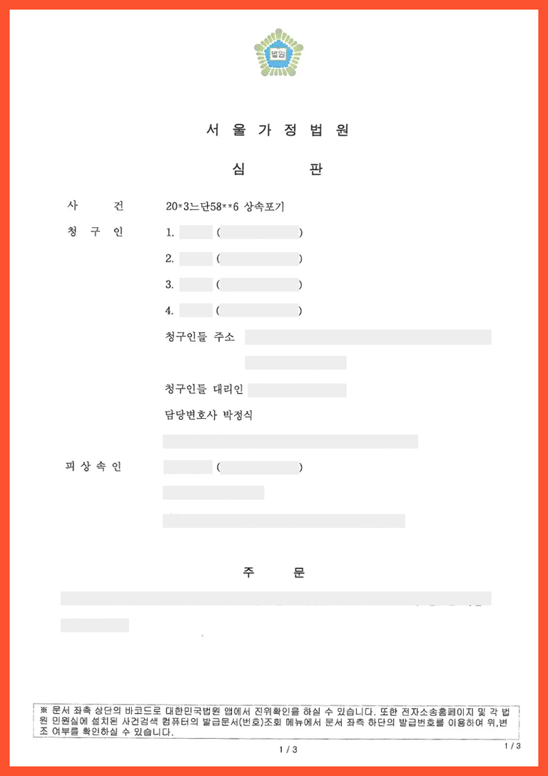 ② 상속포기를 하는 상속인들 중 미성년자가 있는 경우에는 미성년자의 친권자인 부모가 법정대리인이 되어 상속포기심판청구를 할 수 있다고 판단하여 청구인과 청구인의 자녀들의 상속포기 신고를 수리하는 심판 결정이 난 사안입니다.