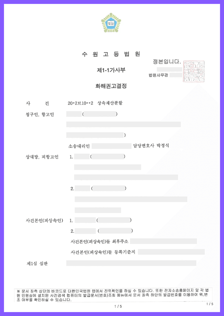 사건 진행 도중, 각 상속개시시를 기준으로 재판부가 권유하는 내용으로 화해권고결정이 이루어졌기 때문에, 추가적인 쟁점에 대해서는 심리가 이루어지지 못했습니다.