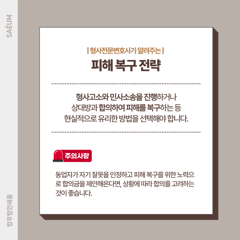 손해배상은 형사고소와 별도로 민사소송으로 진행하거나, 상대방과의 합의를 통해 피해를 복구하는 방법도 가능합니다. 만약 동업자가 자기 잘못을 인정하고 피해를 복구하려는 의사를 보이며 적절한 합의금을 제안한다면, 상황에 따라 합의를 고려하는 것도 실질적인 해결책이 될 수 있습니다.
