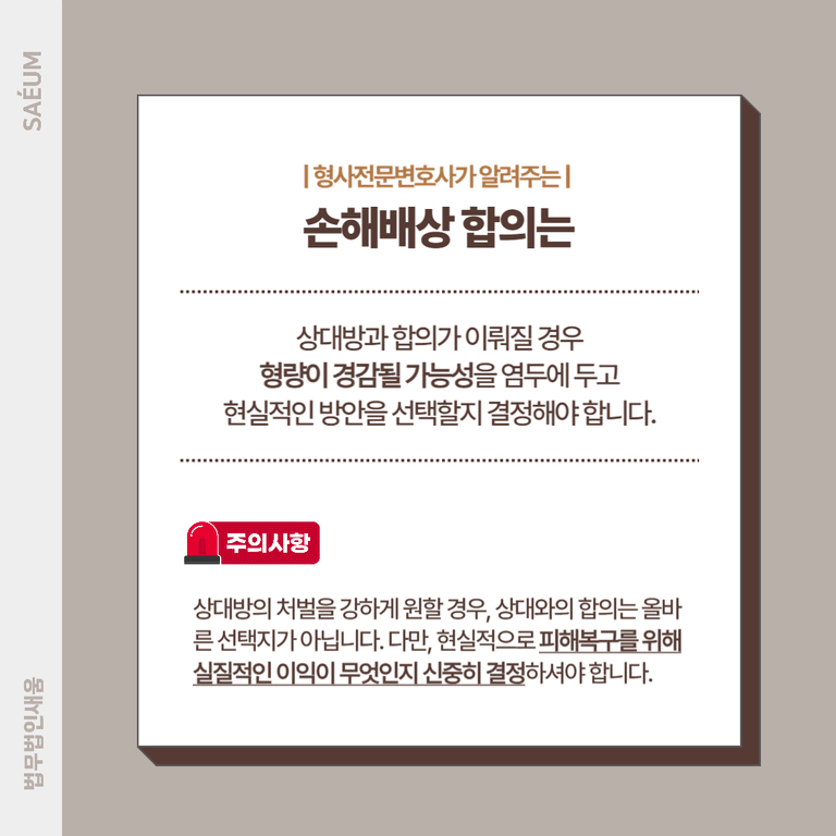 합의를 진행할 때는 상대방이 피해복구에 얼마나 적극적인 태도를 보이는지, 그리고 합의를 통해 얻을 수 있는 실질적 이익이 무엇인지를 자세히 검토해야 합니다. 합의가 이루어질 경우, 상대방의 형량이 일부 경감될 가능성이 있다는 점을 염두에 두고, 상대방의 처벌을 강하게 원할 것인지 아니면 현실적인 해결책을 선택할 것인지 신중히 결정해야 합니다.