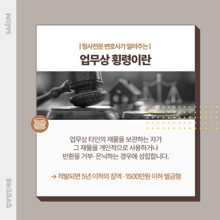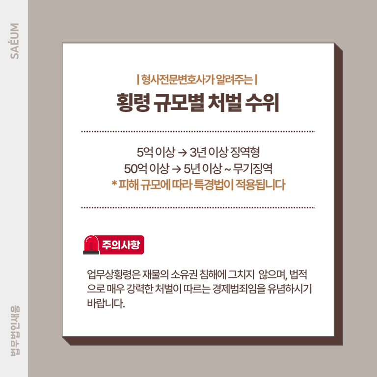 특히 동업 관계에서 발생하는 횡령은 업무 중 발생한 범죄로 간주하여 업무상횡령죄가 적용됩니다. 이 경우 처벌 수위가 더 높아져, 10년 이하의 징역 또는 3,000만 원 이하의 벌금형이 선고될 수 있습니다. 또한 횡령 규모가 크다면 특정경제범죄 가중처벌법(특경법)이 적용되는데요. 횡령액이 5억 원 이상일 경우 최소 3년 이상의 징역형, 50억 원 이상일 경우 최소 5년 이상의 징역형 또는 무기징역까지 선고될 수 있습니다.