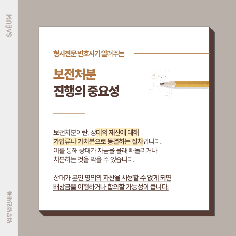 특히 보전처분을 통해 상대방이 본인 명의의 재산을 자유롭게 사용할 수 없게 되면, 사전에 배상금을 이행하거나 합의에 나설 가능성이 커집니다. 강제집행으로 이어질 때도 상대방의 재산을 안정적으로 처분하여 손해배상금을 회수할 수 있는 기반이 마련됩니다. 이러한 이유로, 피해복구를 위해서는 보전처분을 적극적으로 검토하고 활용하는 것이 좋습니다.