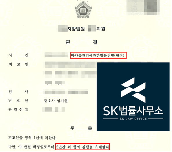 법원은 본 변호인의 주장을 받아들여 마약류관리법위반 혐의에 대해 법정 구속하지 않고 집행유예를 선고하였습니다.SK 법률사무소의 강점