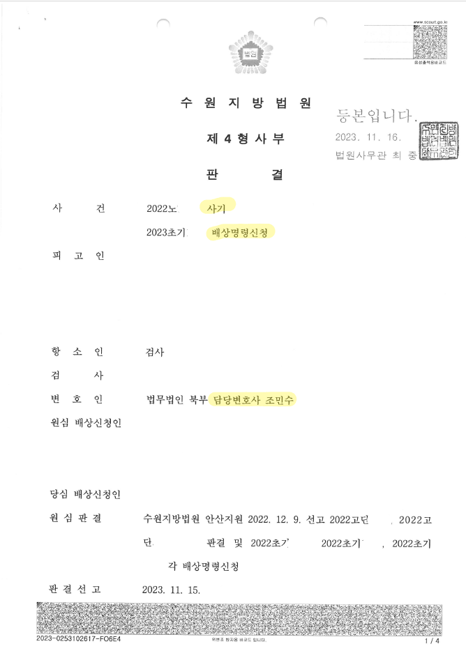 수원지방법원 안산지원에서는 변호인의 의견을 수용하여 집행유예 판결을 선고하였음. 이에 검찰이 바로 항소하였으나, 변호인이 항소심에서도 적극적으로 변호하여 검찰의 항소까지 기각시켰음. 더구나 피해자들의 배상명령신청 역시 적극 방어하여 전부 각하시켰음.