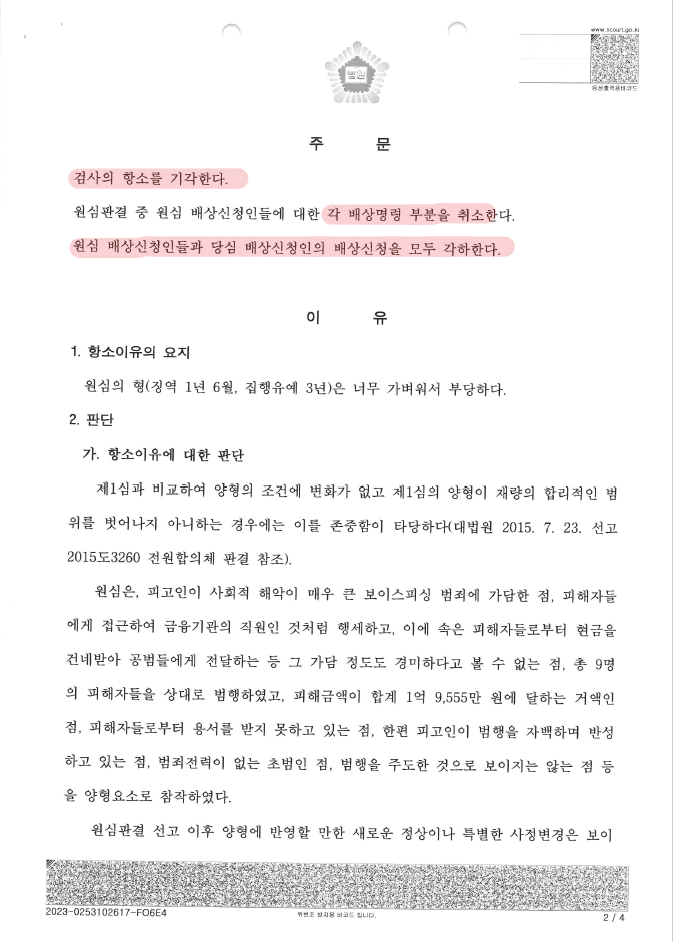 최근 보이스피싱 사건의 경우 초범이라도 2년 이상의 실형을 선고하고 있고, 피해자와 합의를 전혀 하지 않았음에도, 본 변호인의 적극적인 변호로 집행유예 판결을 받을 수 있었음.