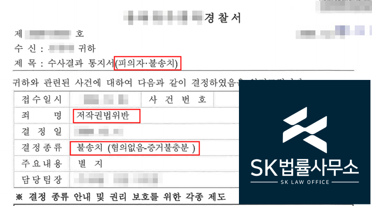 경찰은 본 변호인의 주장을 받아들여 저작권법위반 혐의에 대해 불송치 결정하였습니다.