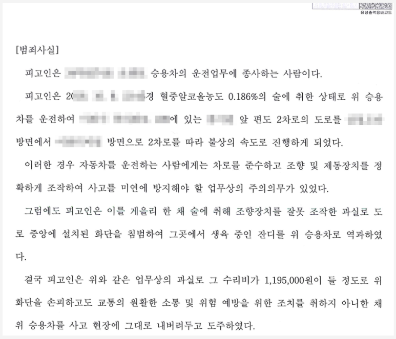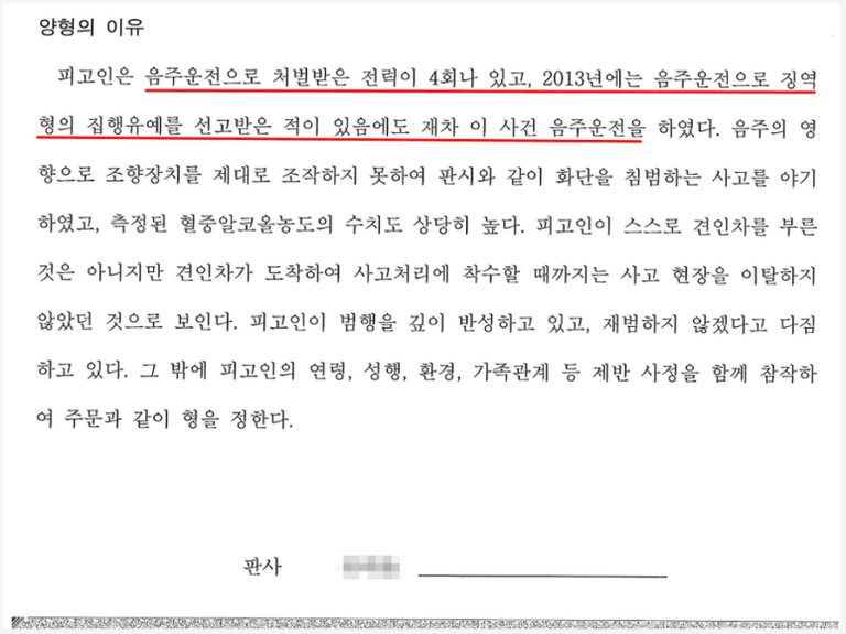변호인은 먼저 의뢰인이 음주운전으로 인한 사고를 경험하고 특히 난생 처음 수감생활을 하면서 자신의 잘못을 진지하게 돌아보고 반성하고 있다는 점을 보여주기 위하여 노력하는 한편 사고의 내용이나 사고 후 현장의 상황을 고려할 때 2차사고의 위험성이 비교적 크지 아니하였고, 의뢰인은 현장에 경찰관이 도착한 이후 자진하여 운전자임을 밝히고 음주측정에 협조하는 등 양형에 참작할 요소가 있다는 점을 보여주었습니다.
