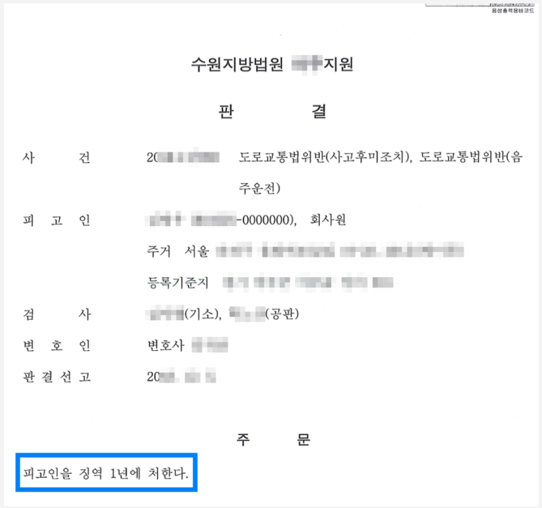 이로 인하여 의뢰인은 제1심에서 사고후미조치와 음주운전의 죄로 징역 1년의 실형을 선고 받고 수감되었고, 이후 제1심 판결에 대하여 항소하였습니다.