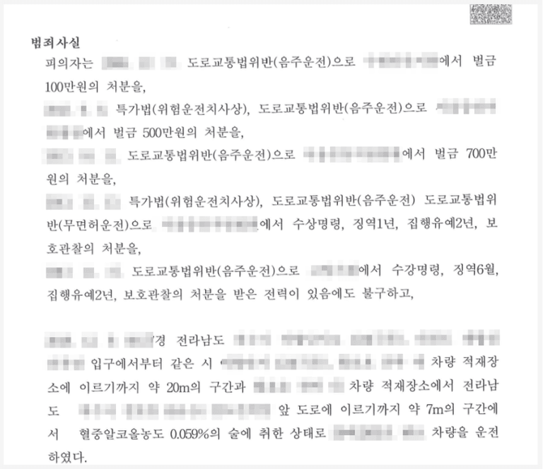 의뢰인은 과거 5회의 음주운전 전력이 있었는데, 그 중 2회는 술에 취한 상태에서 운전을 하다가서 사람을 다치게 하는 사고까지 낸 것이었고 무면허 운전으로 처벌받은 전력도 있었습니다. 특히 이와 같은 범죄로 인해 의뢰인은 2차례 징역형의 집행유예를 선고받기도 했었습니다.