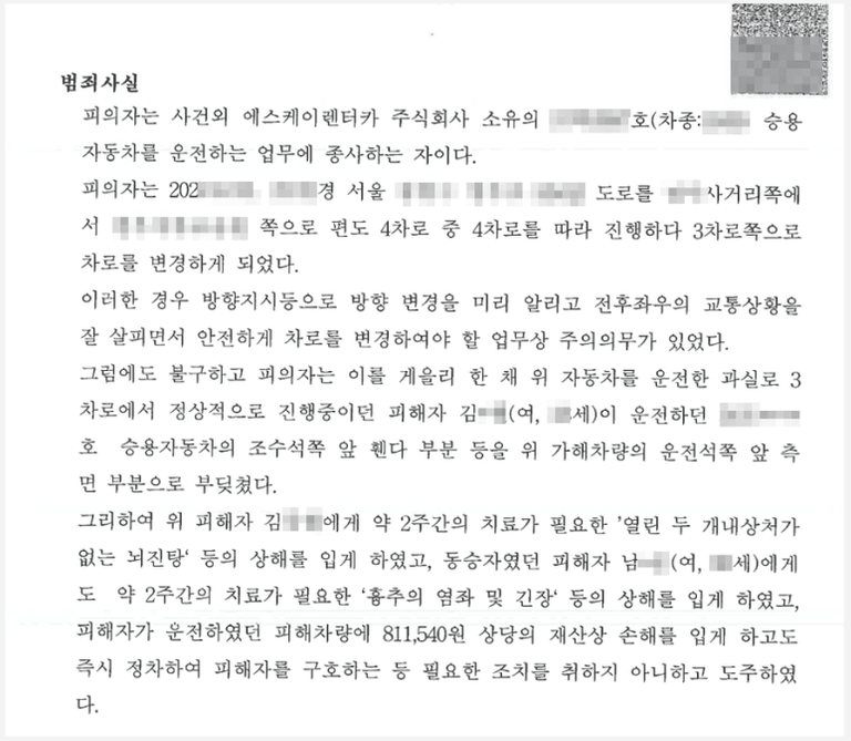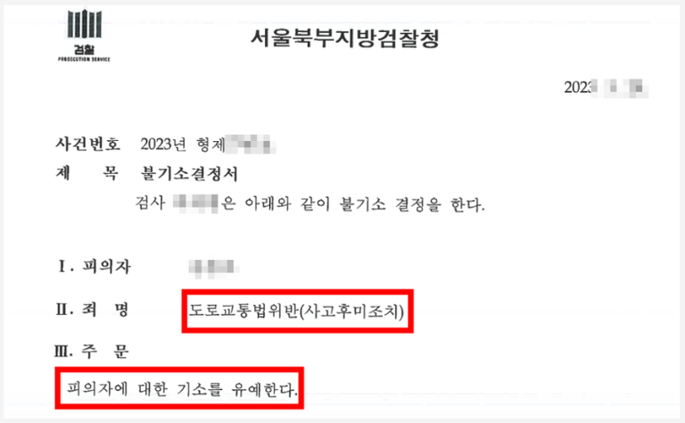 이 사고로 인하여 피해 차량에 탑승하고 있던 2인의 피해자들은 각 ‘열린 두 개내 상처가 없는 뇌진탕’ 및 ‘흉추의 염좌 및 긴장’ 등의 상해를 입었는데, 의뢰인은 현장에서 정차하여 사고처리를 하지 않고 도주하였고, 이로 인해 결국 경찰의 수사를 받게 되었습니다.