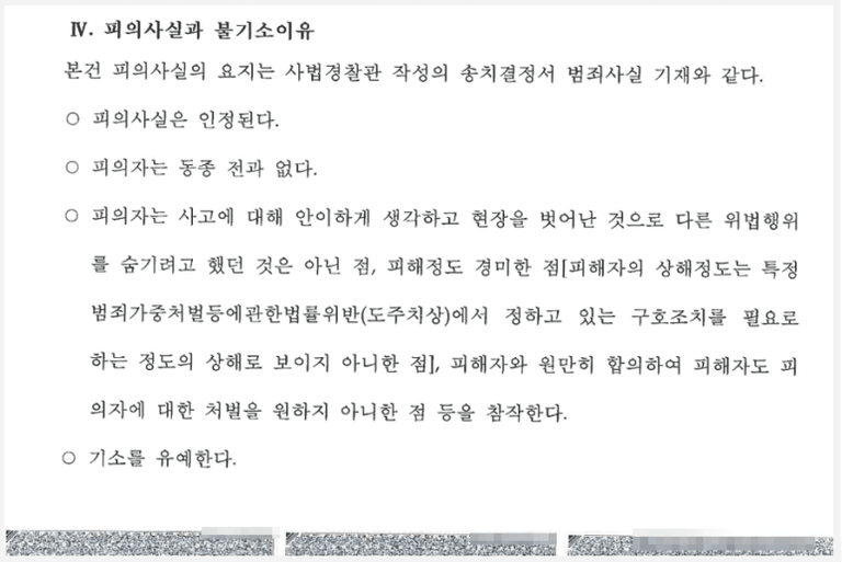 그러나 도로교통법은 2회 이상의 음주운전을 한 경우 반드시 면허를 취소하도록 규정하고 있고, 특히 사람을 다치게 하는 사고를 내고도 도주한 경우에는 면허를 취득할 수 없는 결격기간이 4년(음주 뺑소니의 경우에는 5년)이었으므로 이 사건으로 인하여 유죄가 인정되면 의뢰인은 생계가 막막해지는 상황이었습니다. 따라서 의뢰인에게는 기소유예 처분이 절실한 상황이었습니다.