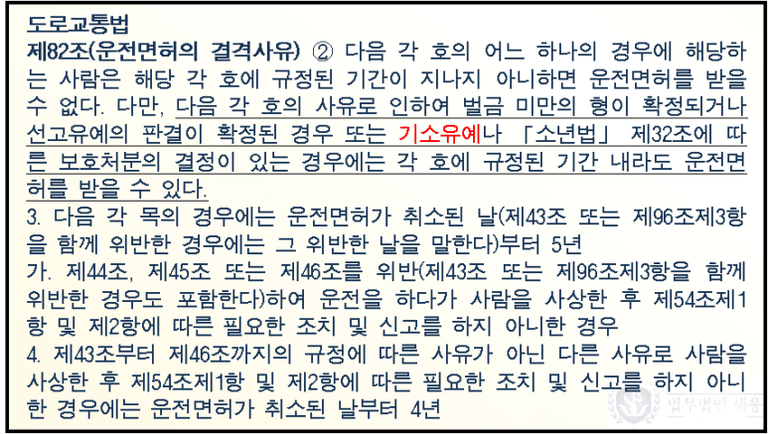 ※교통 관련 범죄로 인하여 면허가 취소되는 경우, 검사의 기소유예 처분을 받게 되면 면허취소처분은 유효하지만 결격기간이 적용되지 않으므로 즉시 면허를 재취득하는 것이 가능합니다.