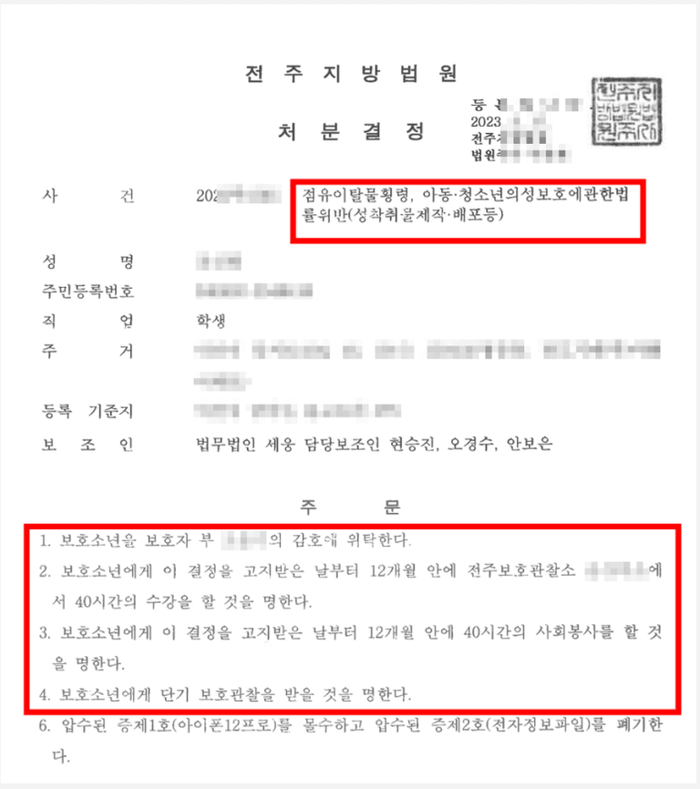 이와 같은 변호인과 의뢰인, 그리고 의뢰인 부모님의 노력이 모아져 의뢰인은 검사의 보호처분 송치 및 가정법원의 1호~4호 보호처분을 받을 수 있었고, 대학에 진학하여 성실히 학업에 임할 수 있게 되었습니다.