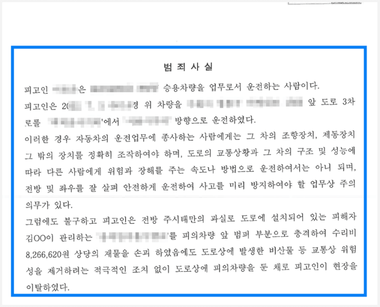 이와 같은 효과적인 변호 덕분에 의뢰인은 음주운전 혐의에 대해서는 어떠한 처벌도 받지 아니하였고, 사고 후 미조치에 대하여도 검사의 약식기소를 통해 벌금 100만 원으로 마무리할 수 있었습니다.
