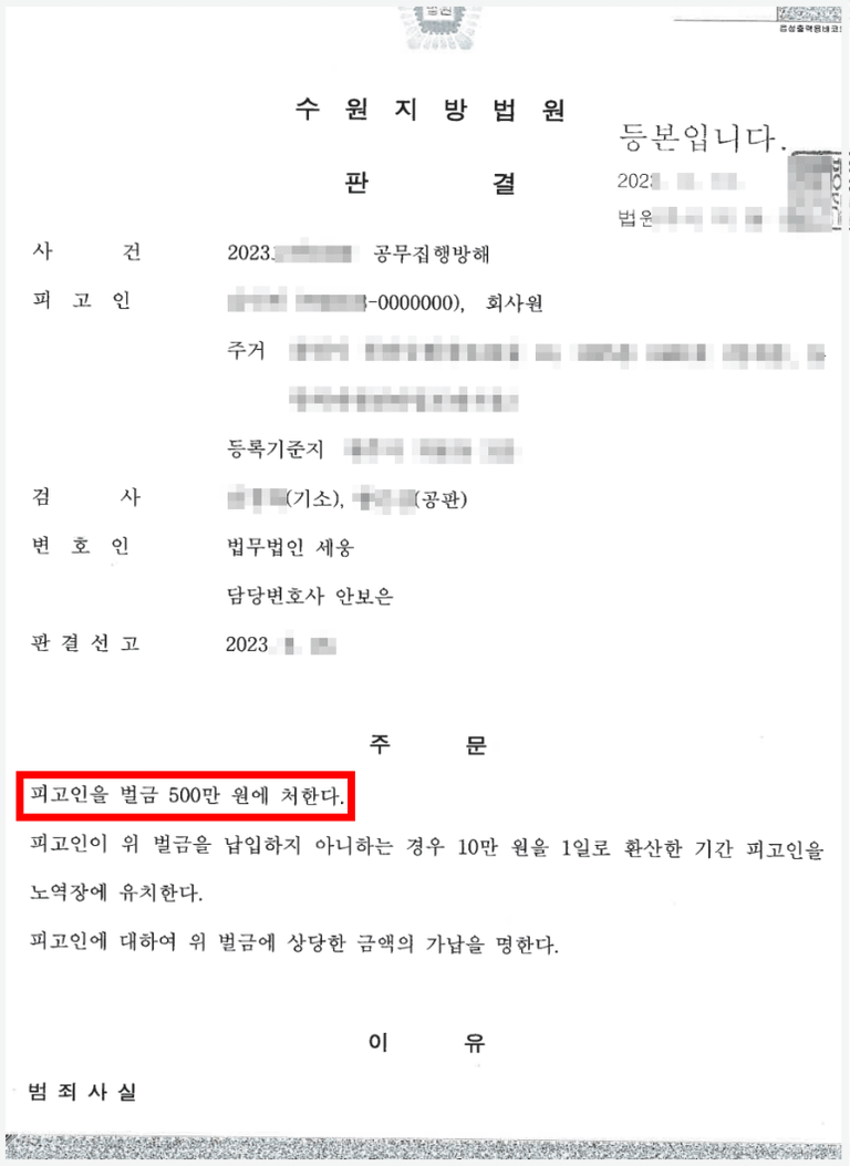 이러한 적절한 대처 덕분에 검사가 징역 6월의 실형을 구형하였음에도 법원은 의뢰인에게 벌금 500만 원의 선처를 하여주었습니다.