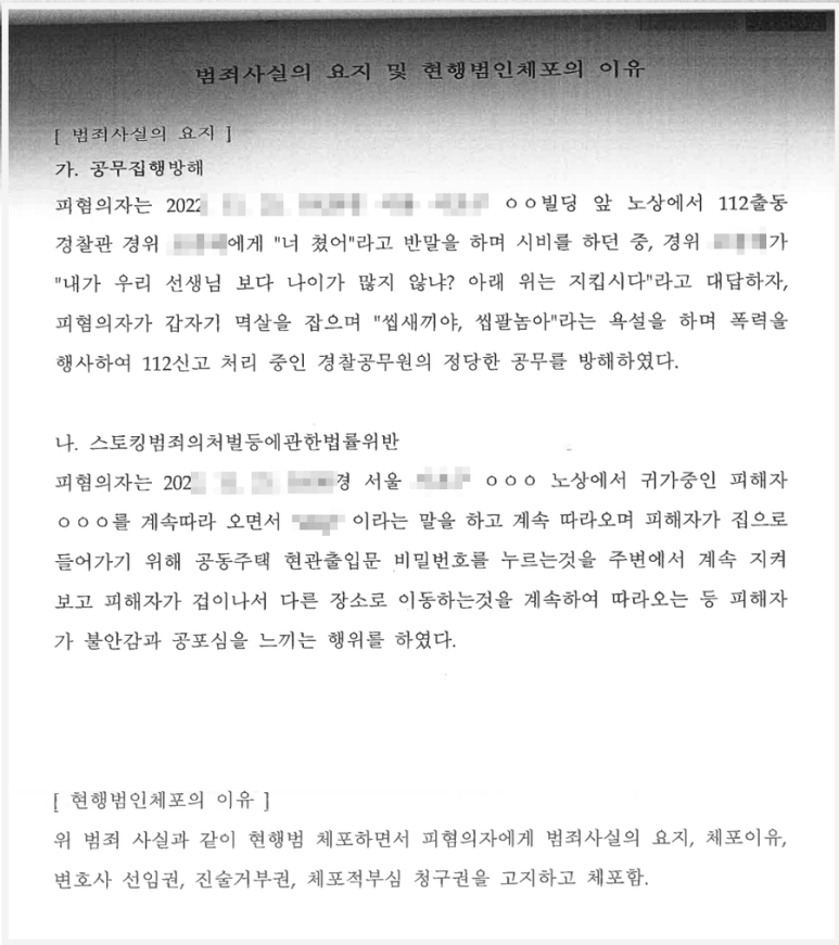 의뢰인은 직장 동료들과 술을 마시고 만취하여 인사불성이 된 상태로 생면부지의 여성을 따라가고 여성의 집 앞 현관에서 비밀번호를 누르는 것을 지켜보는 등의 행위를 하다가 신고를 당했습니다. 그런데 의뢰인은 출동한 경찰관에게 욕설을 하고 멱살을 잡는 등의 폭행을 하였고 이로 인하여 현장에서 스토킹범죄의처벌등에관한법률위반 및 공무집행방해로 현행범 체포되었습니다.