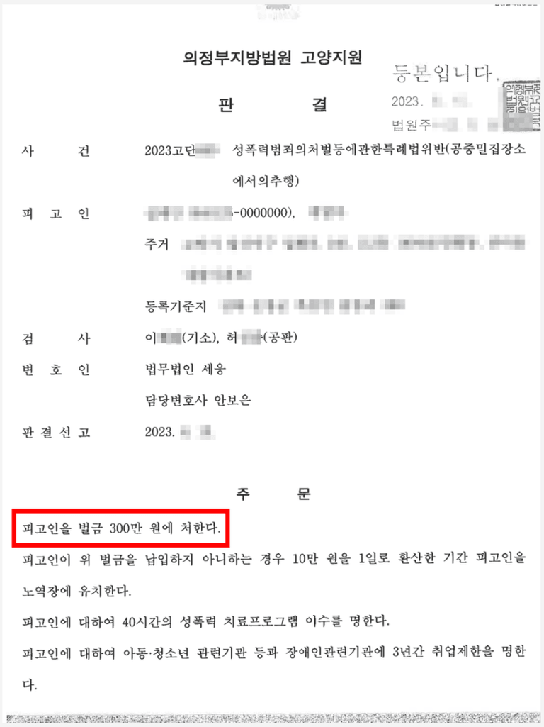 이러한 노력 덕분에 검사가 약식기소한 사건을 법원에서 직권으로 정식재판에 넘겼음에도 불구하고, 법원은 의뢰인에게 벌금형과 공개·고지명령 면제의 선처를 하였습니다.