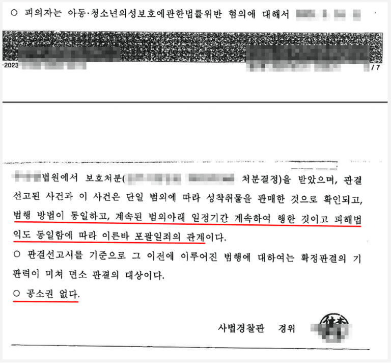 ※ 단 사법경찰관은 이 사건에 대하여 확정판결의 기판력이 미쳐 면소판결의 대상이므로 공소권이 없다고 판단하였으나, 이는 법률지식이 부족한 경찰관의 실수입니다. 소년법상 보호처분은 확정판결이 아니므로 기판력이 없고 소년법 제53조의 규정에 따라 공소를 제기할 수 없을 뿐이므로, 확정판결이 있었던 사건에 대하여 다시 공소가 제기되었을 때와는 달리 면소 판결이 아닌 공소기각의 판결을 해야 하는 것입니다(대법원 1996. 2. 23. 선고 96도47 판결). 다만 볼송치(공소권없음) 결정이라는 결과에 있어서는 차이가 없으므로 달리 문제제기를 하지는 아니하였습니다.