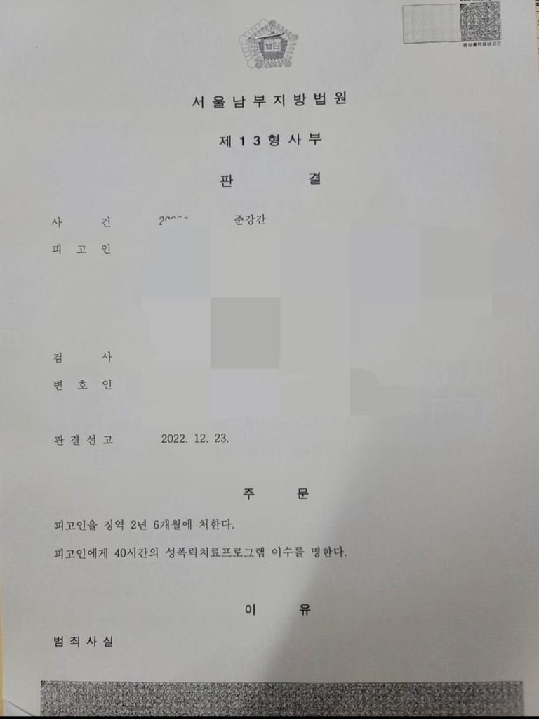 그 결과 1심에서 가해자는 2년6월의 실형을 선고받고 법정구속되었습니다. 피해자는 원래 민사소송으로 피해를 배상받고자 하였으나 심경의 변화를 일으켜 2심에서 5천만원에 합의를 하였고 가해자는 집행유예를 선고받았습니다.