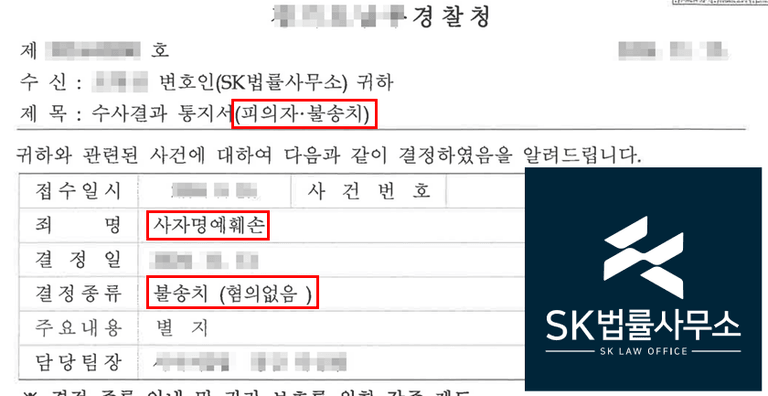 경찰은 본 변호인의 주장을 받아들여 사자명예훼손 혐의에 대해 불송치 결정하였습니다.SK 법률사무소의 강점